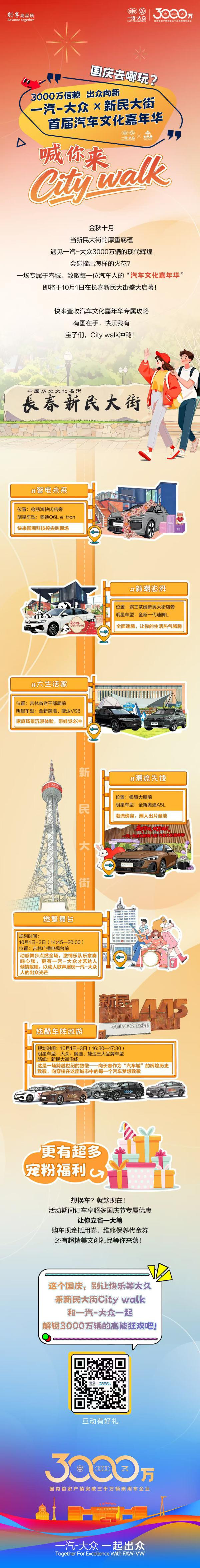 值此荣耀之际,“一汽-大众X新民大街首届汽车文化嘉年华”即将拉开帷幕,活动期望以车为媒,为广大市民游客搭建起一座了解汽车文化、感受城市魅力的桥梁,推动长春文旅产业与汽车工业深度融合,为城市发展注入新的活力。
